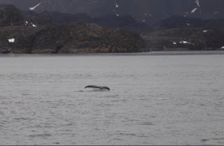Before long the captain announced whales on the left hand side of the ship. Rushing to the port side we saw three humpback whales passing, breaching and flicking their tales, blasts of water giving us forewarning. Not long later, ‘whales, left hand side of the ship’ – another two, swimming along the fjord. Again about twenty minutes passed, ‘whales, right hand side.’ This time several were playing close to the land where we were soon docking in Maritsoq. Absolutely incredible display.
