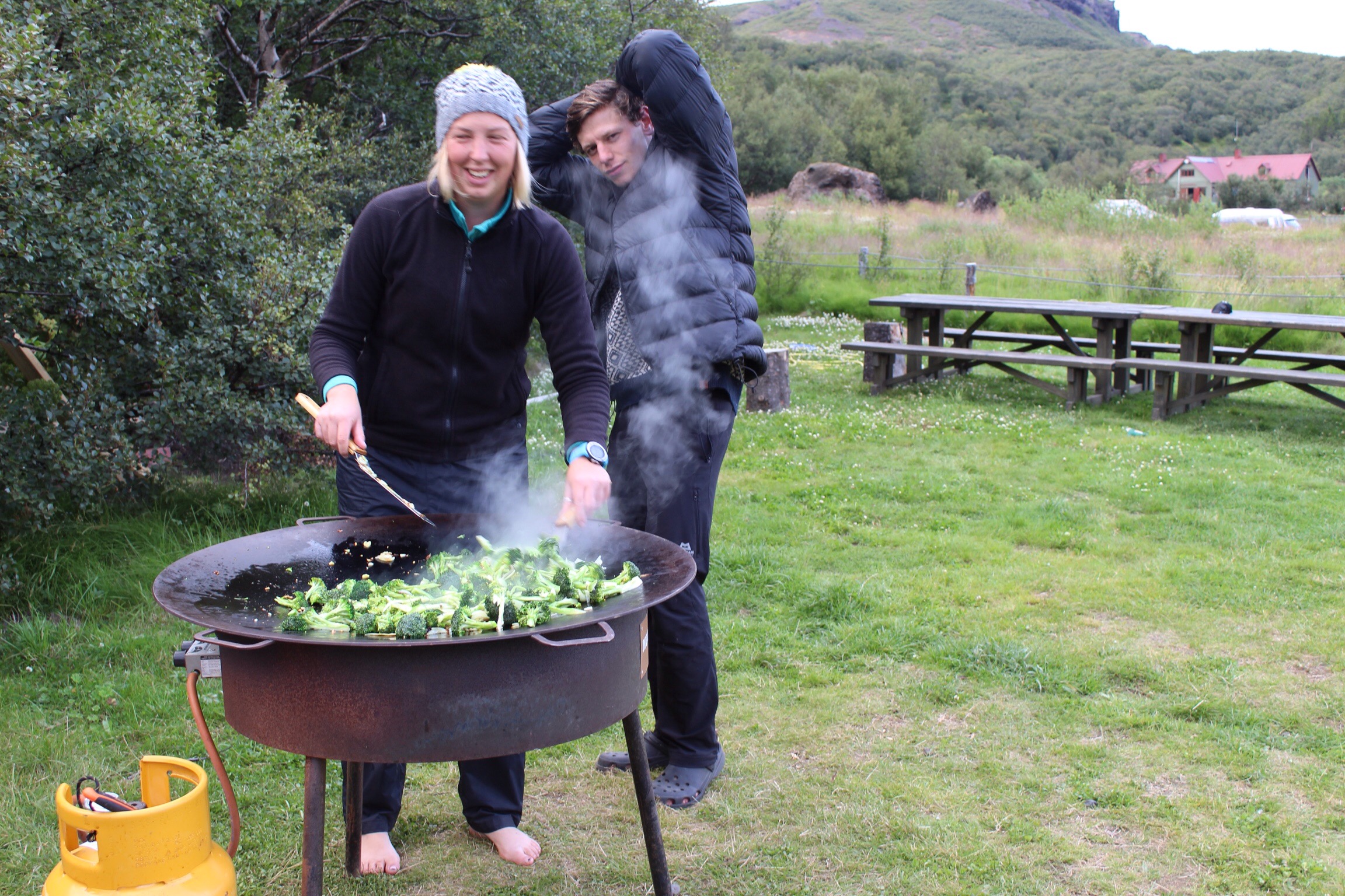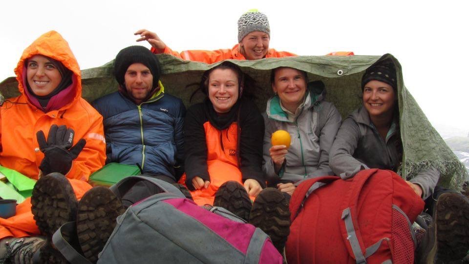 At work, we got the satisfaction of maintaining the trails, adding very little in terms of construction, but lopping, clearing and widening several of the trails, the result being seeing a lot of the area. We worked on Rettafell for two days, clamouring down chains, sorting scree and building with earth. Our mountain sat across the valley from Valahnukur where the Langidalur based team were working, and in our work issued ‘oranges’ they were very visable to us, as we were to them, 2km away. On our lunch break, on an open section of hillside, we used 8 of us to spell ‘HI’ and then phoned them to gauge their reaction.