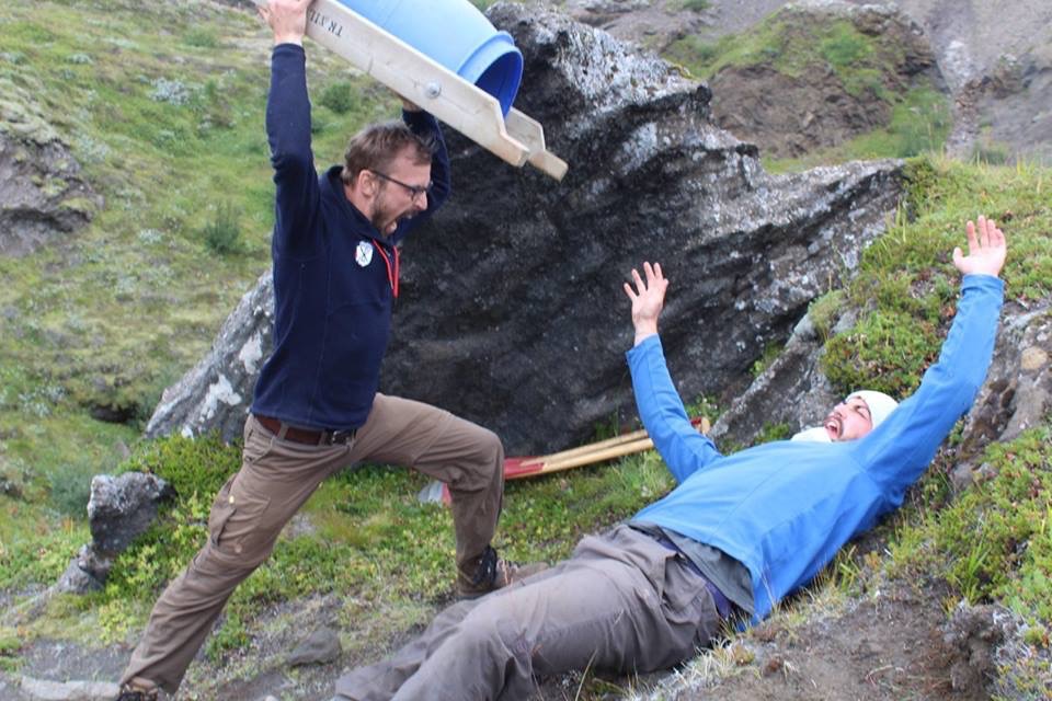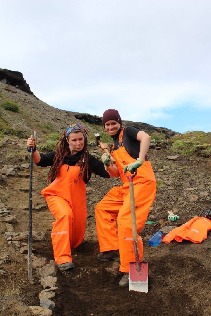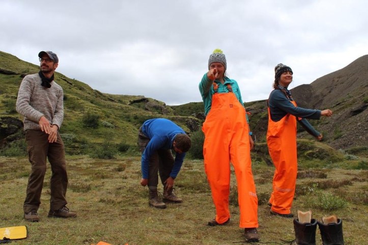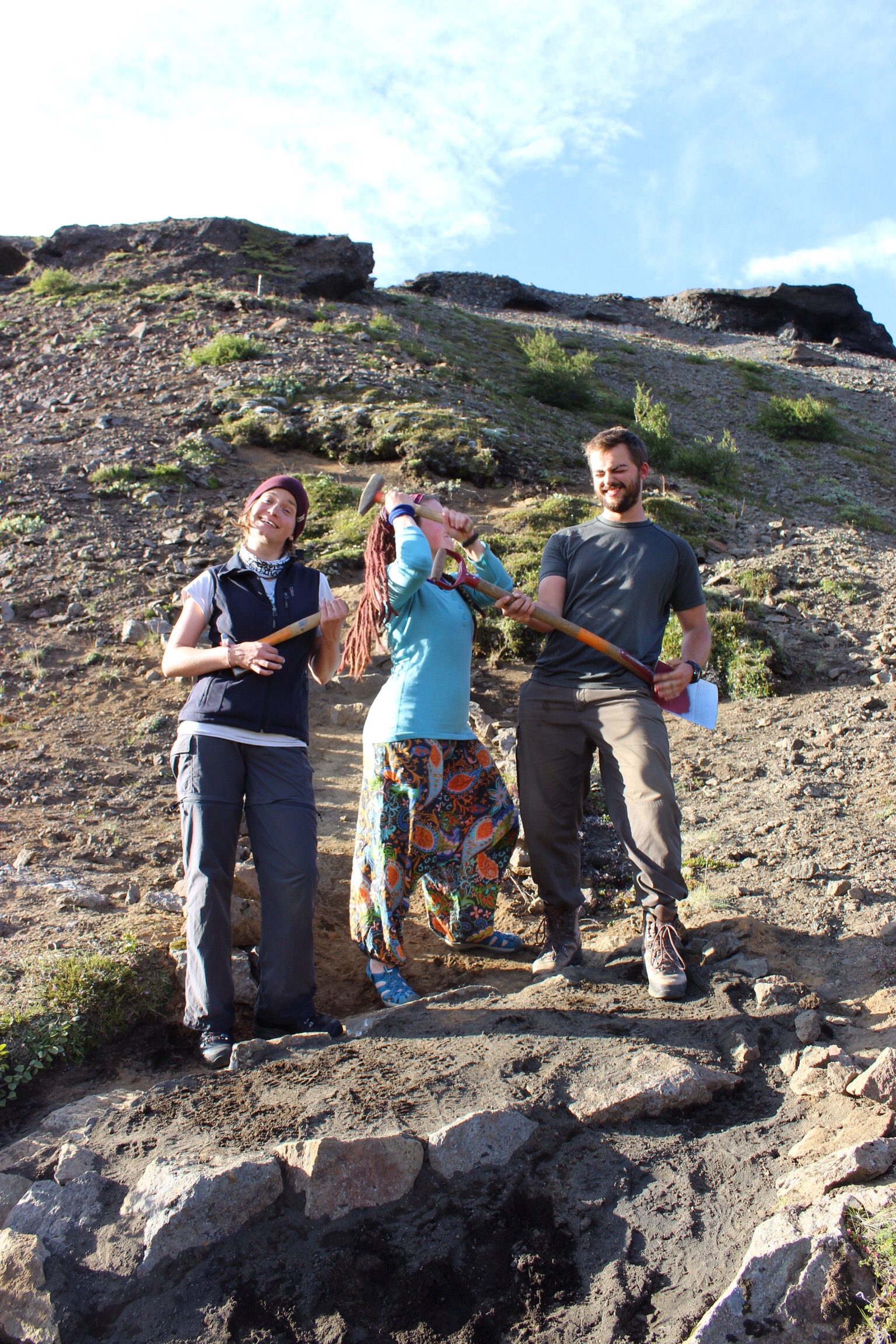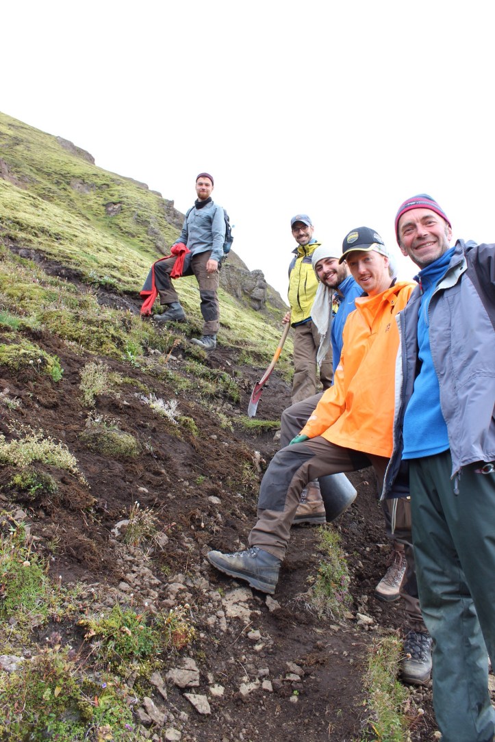 Wednesday and Thursday we had visiting teams come and work with us. We constructed timber steps in the morning, then made bets on who and when they would drop over the ridge armed with tools and food for us. As a large group we worked on the steep sides of Rjupnafell, transplanting moss to the landslip areas, and building earth drains on the lower sections. The parcels of vegetables, followed by chocolate bananas to be cooked over the fire went down a treat after some interesting dinners earlier in the week, the trade off for living in the hills.