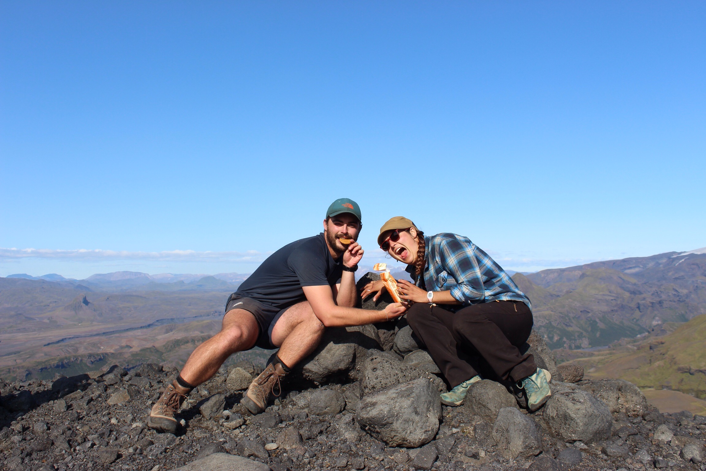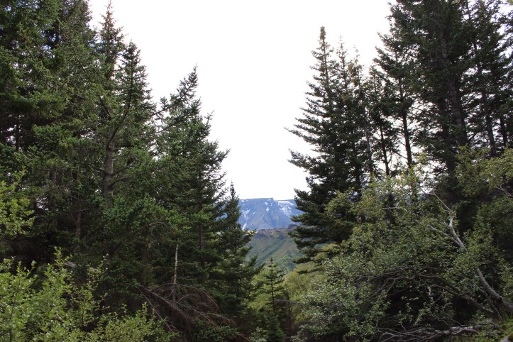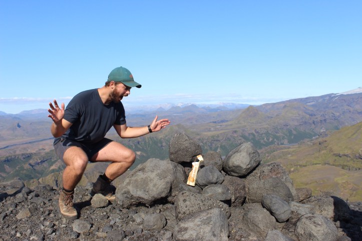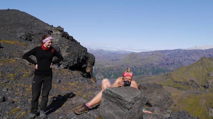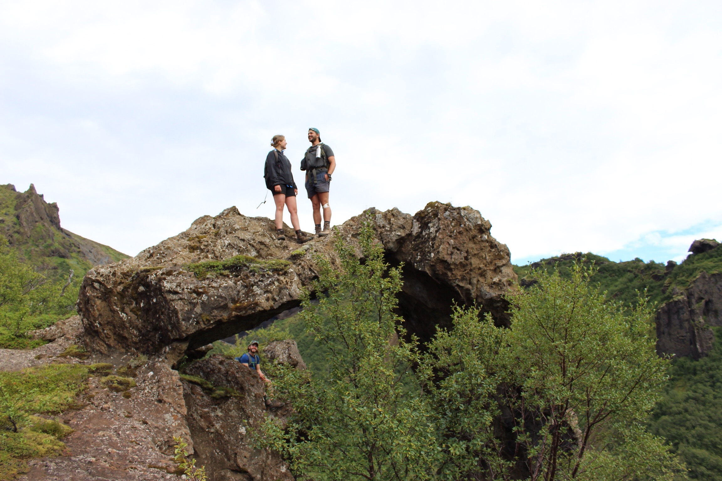 In another adventure, Nina, James, Brad and I attempted to cross the ridge line to find a different route to Rjupnafell. Scaling Eggjar mountain in the warm afternoon sun, we found ourselves cut off by craggy rocks with steep drop aways on either side. We had to embrace the failed hike and retrace our steps, diverting into Storeindi valley. In the valley, the rock structures grabbed our attention. Nina climbed a jut of rock which looked like the head of a Trojan horse, and we came across an archway to nowhere. In the valley we found a patch of fully grown fir trees, a novel thing in a land devoid of forest. Immediately it felt more like other parts of Scandinavia.