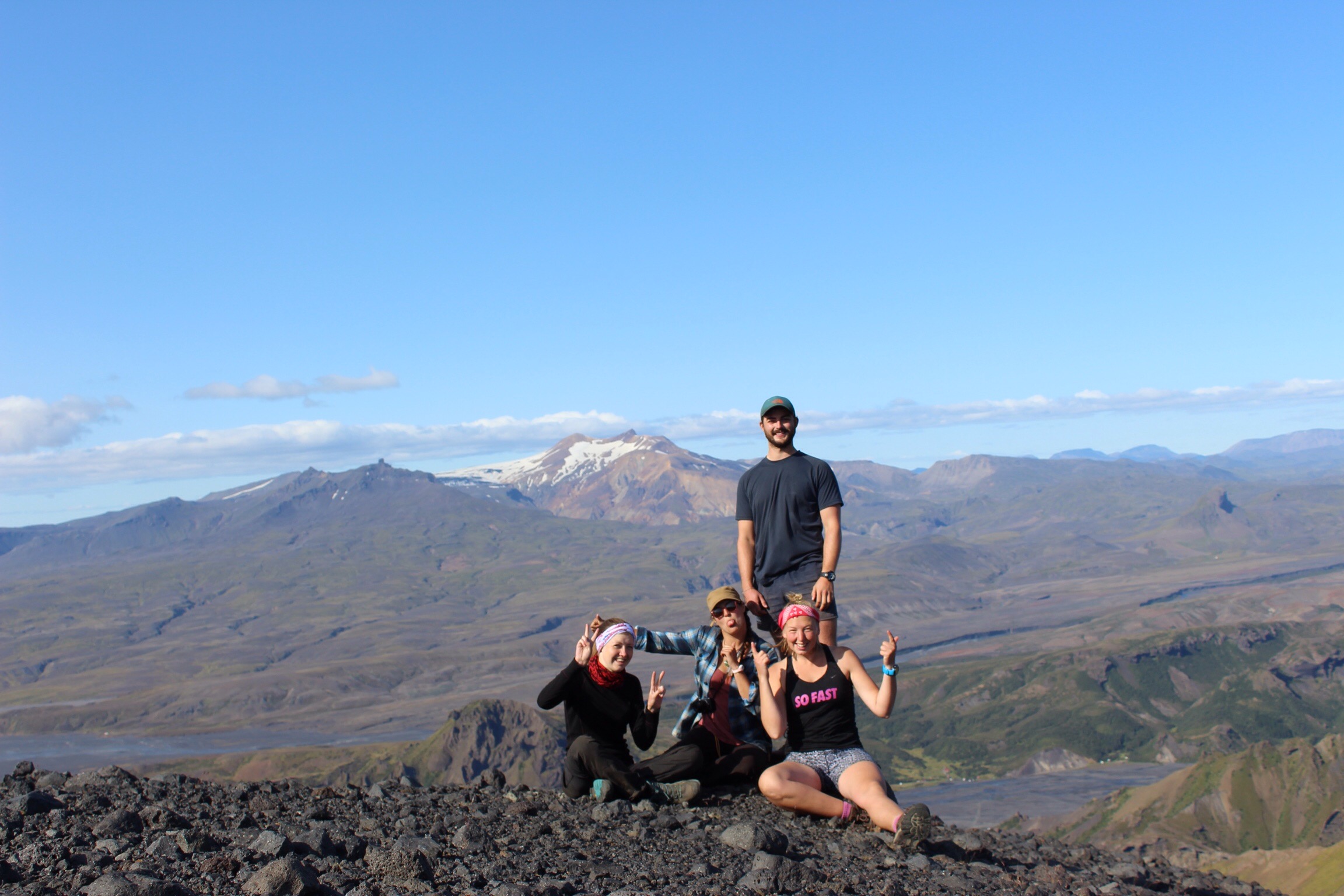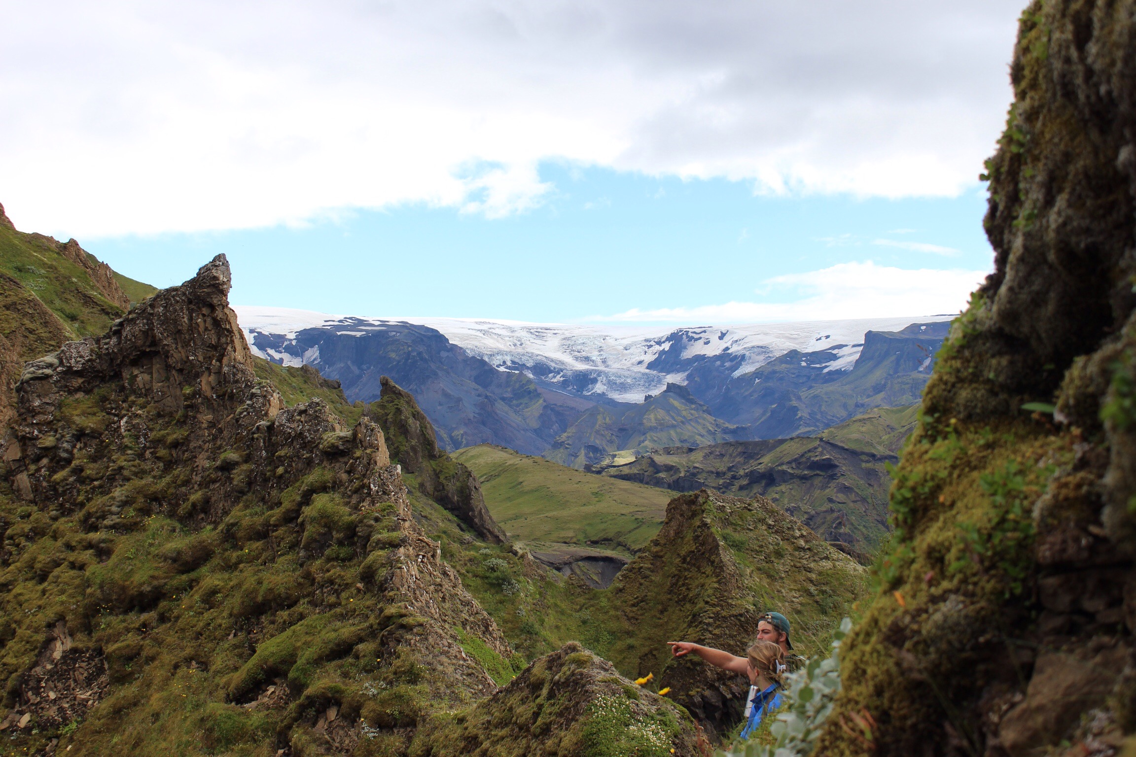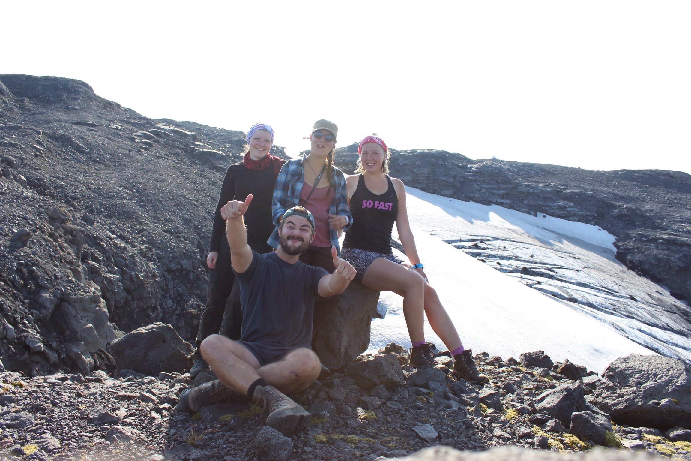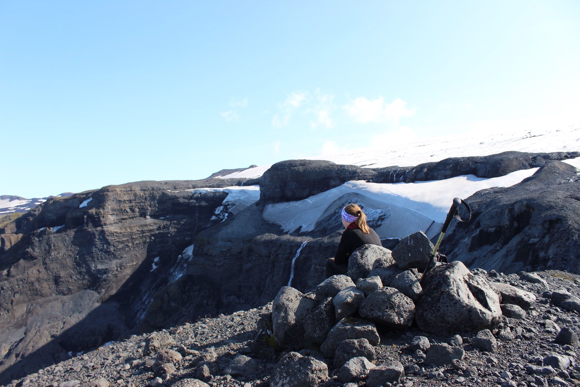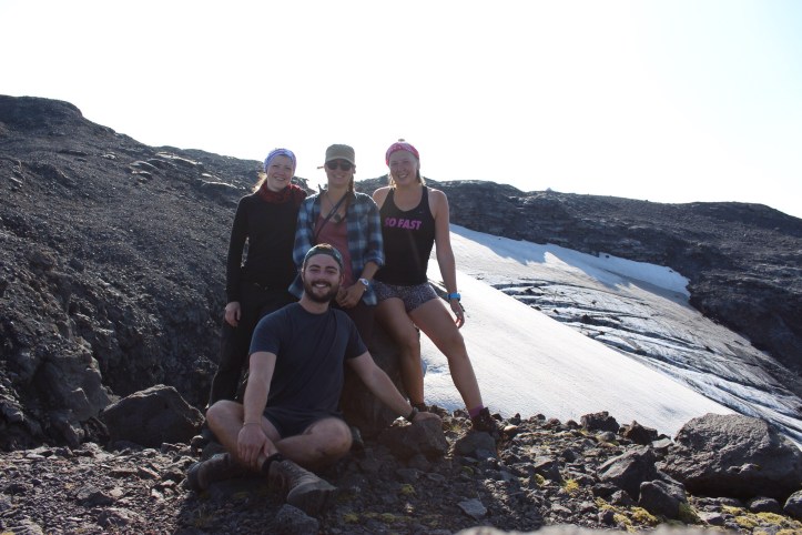 My favourite hike came from the element of adventure of crossing the Hvarna river by foot, and scrambling up and up to walk the plateau. The trail was hinted at by old waymarkers, but didn’t look like it had been walked in years, and higher up the slippery banks it was clear to see why. Only our curiosity pulled us onwards to see how close we could get to the glacier. After a few hours we stood at the foot of Eyjafjallajokull, one of its many glacial tongues, ice caves and waterfalls shrunk in comparison. As we looked back across the valley to camp, our little hut was just visable by the luminous Orange uniforms which hung outside.