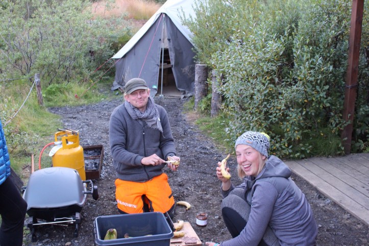 Work was closer to camp, building the final steps on Valahnukur and giving the trails their winter coat of gravel. Some worms fell victim to Micha’s heavy handed turfing methods as she proclaimed, ‘I think I just punched a worm…’ We were terrified to speak out of turn around her. We gravitated back to camp for hot lunches of soup and toasties. The outside grill got use in the evenings too as we cooked chocolate bananas under pinkish skies.