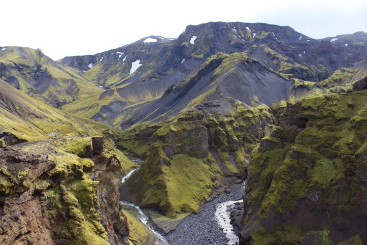 On the weekend Glenn and I walked along the canyon behind Uti, another contender for my favourite walk. The path skirted the edge of the mountain, sometimes sketchily so, climbing gently higher to the ice caves and young lava flows at the edge of the glacier. We climbed up onto the plateau of the Fimmvorduhals trail and made the winding return to camp over a lot of the previous weeks works.
