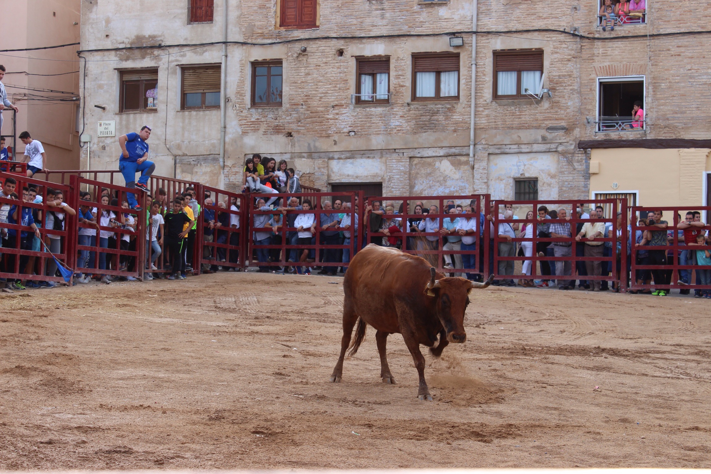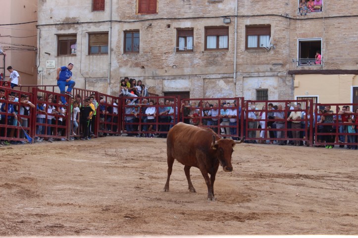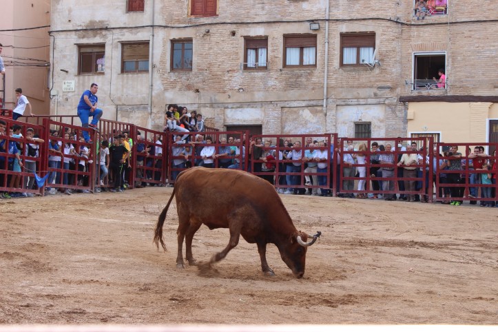 At 6pm a cow was released into the square. At first it was fired up and ran around, occasionally charging the gates, but as it calmed people of the community could slip through the gates and run infront of it, taking refuge behind the opposite gate. It would take chase, or kick its feet in anger. Once exhausted a bull would come out and round it up, and a new cow would take its place. The tradition of bullfighting appeared different here. Still a very community act, people sat out on their balconies or waved Spanish flags, Churros and Cervezas were enjoyed ringside, but anyone was welcome to take part. Young and old taunted the cows with body parts or clothing, dancing as much as they dared through the ring.