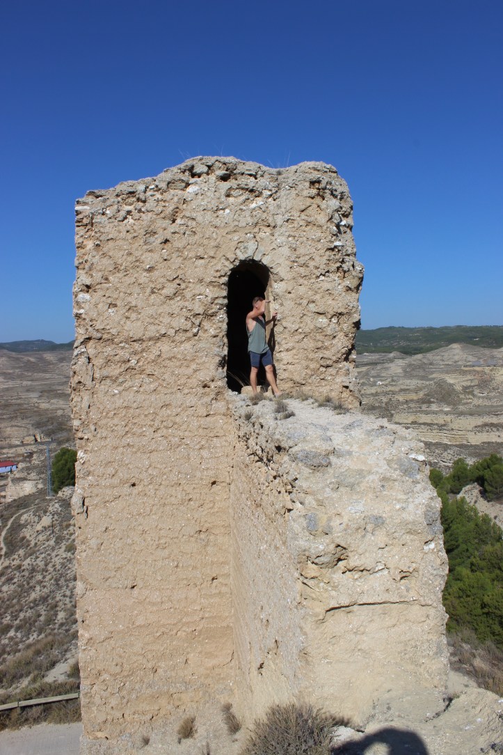 Getting the car back through the winding streets was just as much of a team effort, and David managed his first car journey without falling asleep, albeit 10km. We stopped in small town Calatayud, where it looked like half the buildings in the sleepy old town had ceased to exist and had crumbled into the floor. We climbed up through odd streets and paths making for the castle on top of the hill. Castillo de Ayud is a 9th Muslim century castle, now in ruins and looks long forgotten. Despite signs around the place, the ruins were a health and safety nightmare. You could go inside the lookout towers to discover the stairs dropped away into a dark pit. David enjoyed being Indiana Jones, as I preferred to play on the swings. He took on lookout duty and patrolled the walls of the crumbling castle, the view over the city enviable.