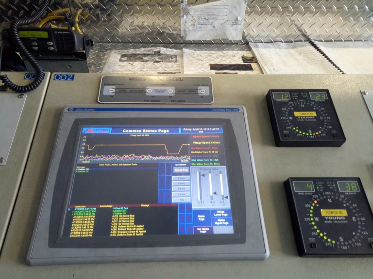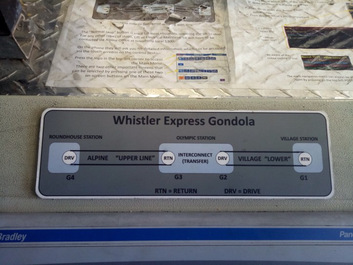 G2 is the mid station of the Whistler Village gondola. Whilst not exactly outside, I didn’t realise how key this middle stop is. The control panels here control the whole gondola which is technically two separate lifts, the village section and the alpine section seamlessly coming together with a change of line. Aaron, the lead hand here explained how to read the controls. Should a stop arise, this is where all the information is, who stopped it and why. Then comes the crucial two bells. Two bells from the top, two bells from the bottom, then it’s time to hit go and get her back up to speed. From the middle here you can also select the running speed, slowing it down when needed.