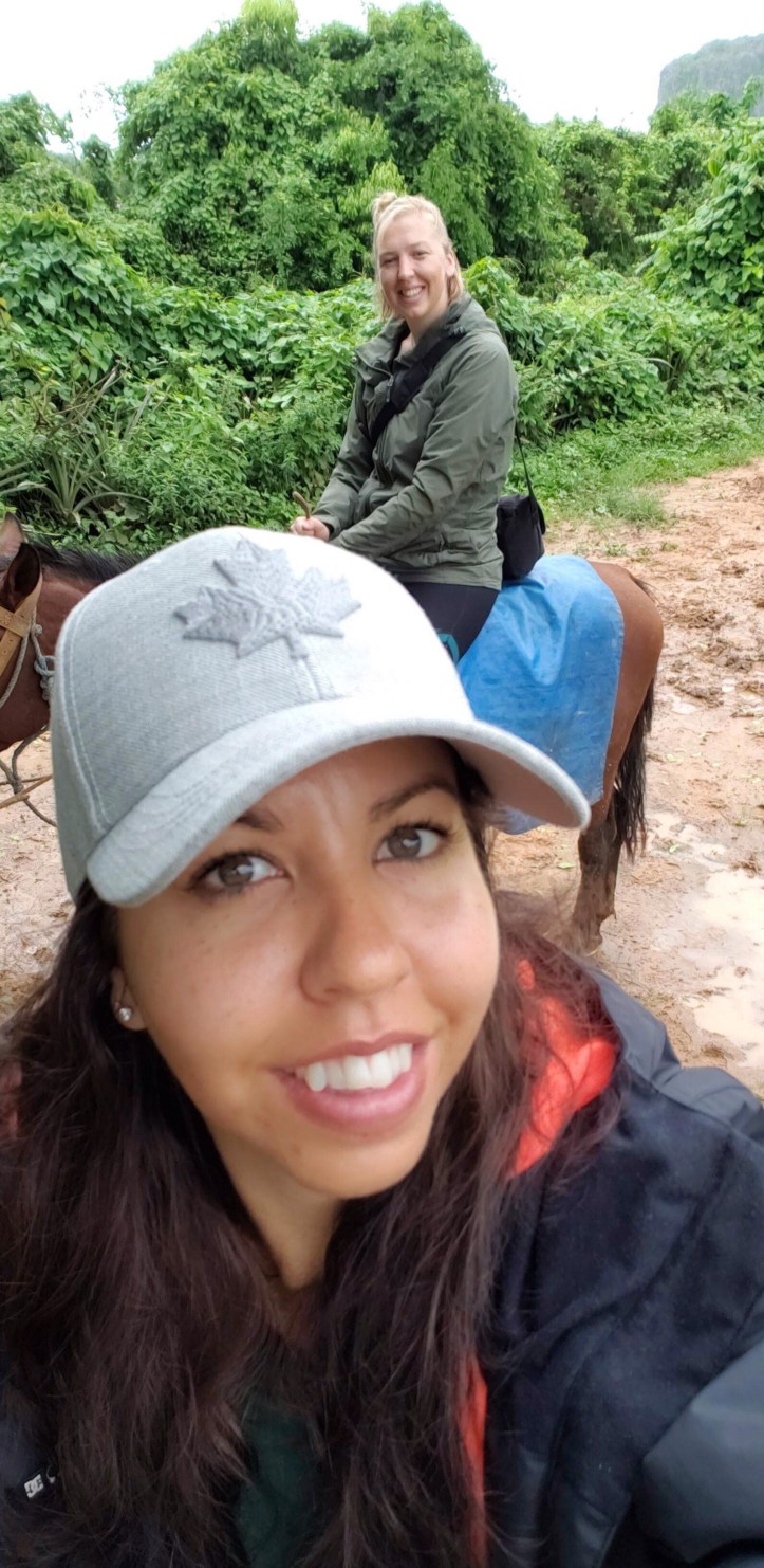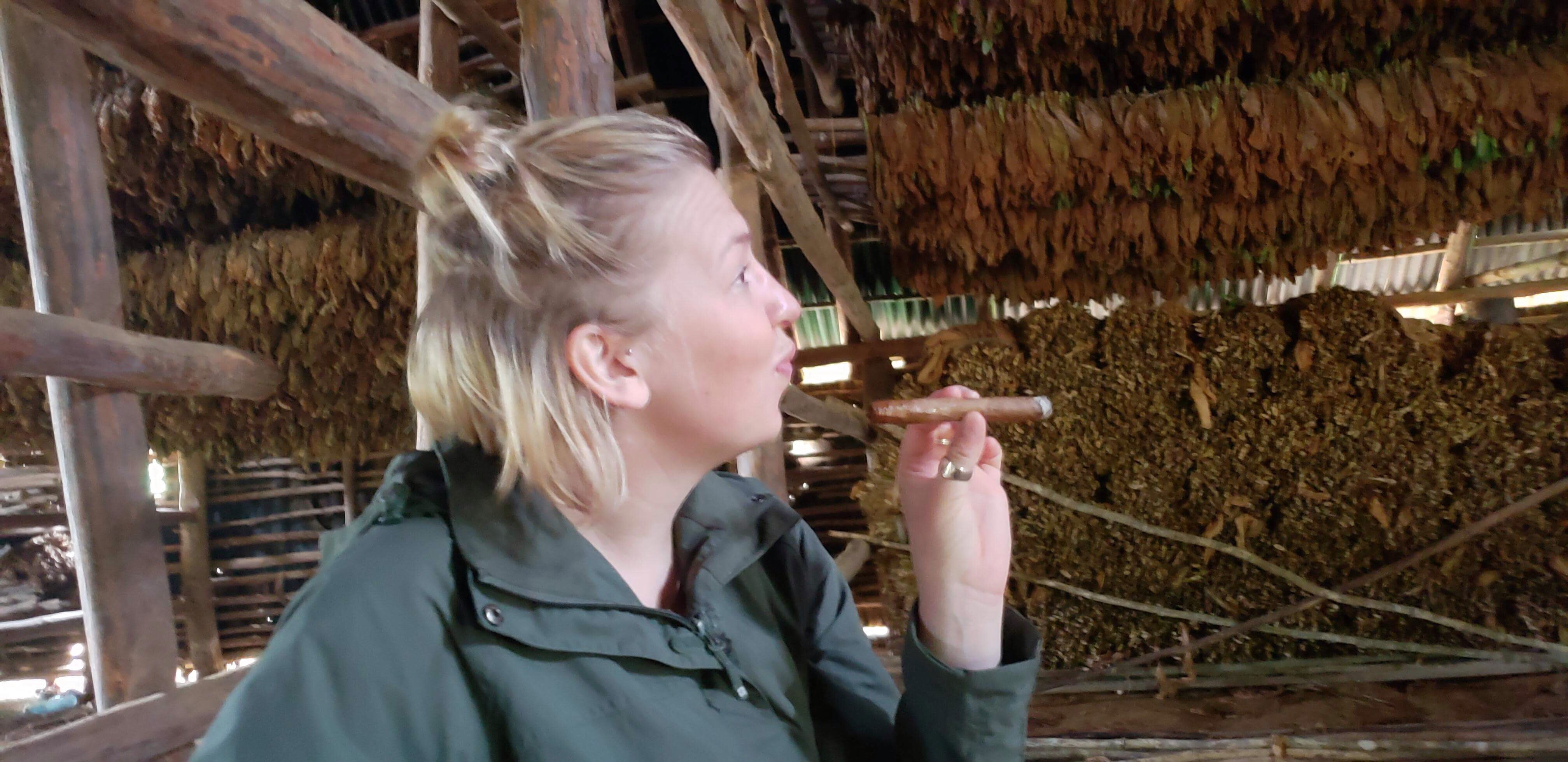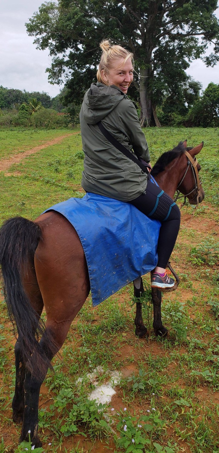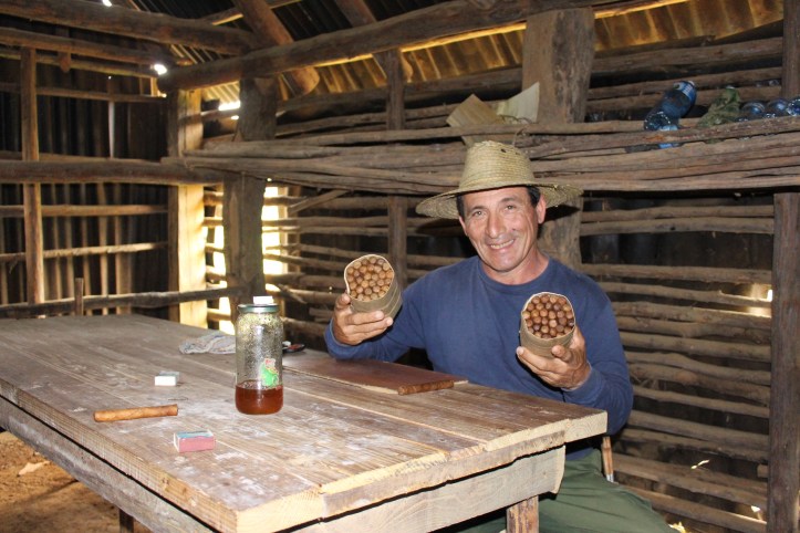 We went to see the production of Cuban cigars at the hands of a friendly farmer. Our horses pulled in at a barn which inside was dark with leaves that would be drying for 3 months. 90% of the bundled leaves would be taken to a factory for mass production whilst 10% selected by the farmer were taken, soaked and scented with cinnamon, honey and other delicious things for several months more. Once they were ready to be turned into cigars the leaves had more of a tough but flexible skin like quality. The leaves were taken, middle artery removed as it holds a lot of the nicotine, and a stack were tightly rolled together. Three parts were then used to seal it, a leaf to concertina around the outside and one for each end. The fixative was honey. It still needs 24 hours more to set after this process. We were invited to try a cigar. They dipped the end in honey, again to add more flavour. Monique was getting lots of compliments as she breathed in the smoke, held it and slowly released it out, ‘good smoker’ he complimented. I couldn’t do it convincingly and retired.