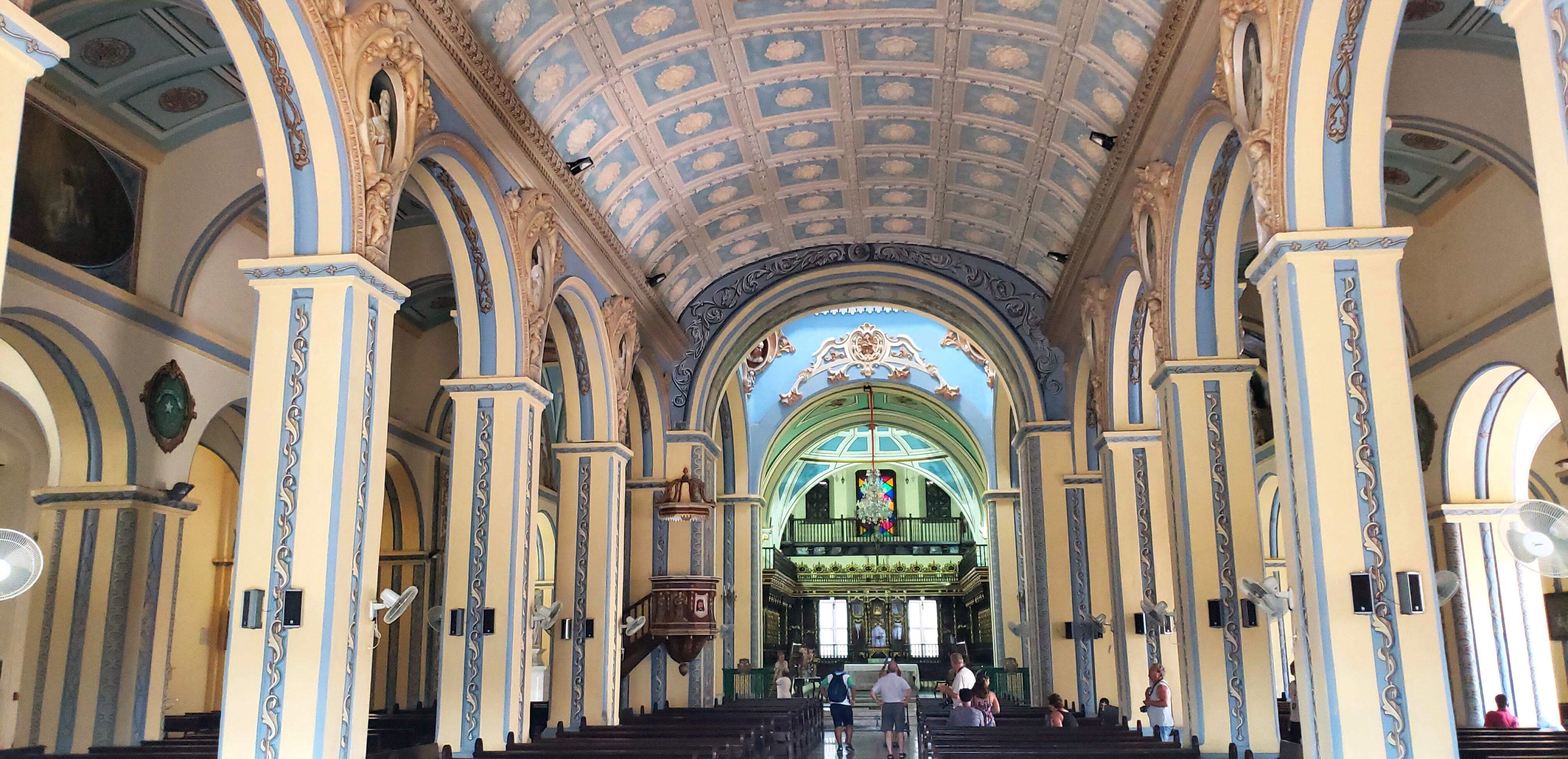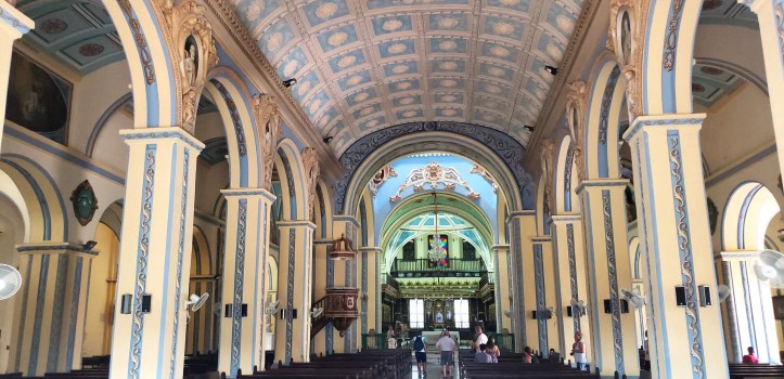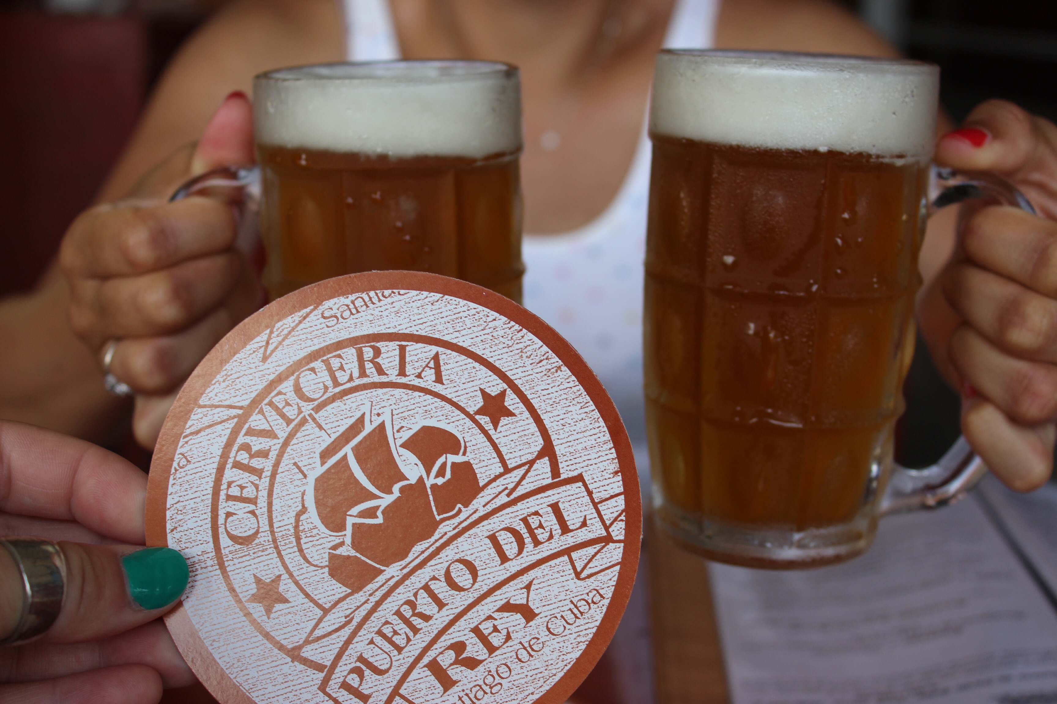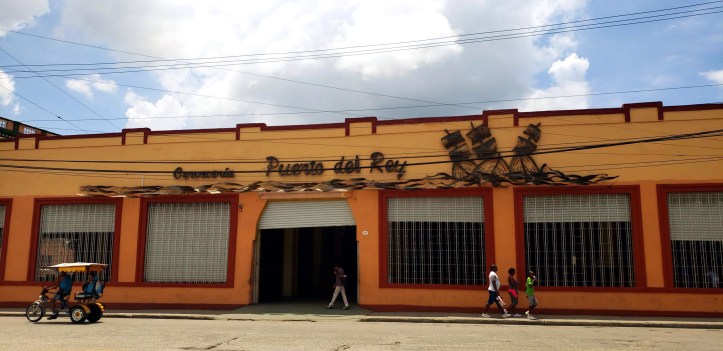 We were pulled off the main street by a blue building which caught our attention. It turned out to be the Cathedral which was light blue Neoclassical style with white detailing, as if frosting on a cake. A quick glance inside showed more blue intricate designs, but I was quickly shown out for wearing shorts and directed up the viewing tower to a spectacular viewpoint. The steeply ascending stairs led to a panoramic view, port ahead, city sprawling all around and a fortress at the mouth of the bay, the Castillo de Morro. With our bearings tapped in we made our way to the water, calling in at markets and pet shops along the way. Here, on the waterside, the streets widened out to accommodate modern buses and archaic army trucks, bike taxis and mopeds, all side by side. The waterfront also had a brewery. Part modern and shiny, part blocky, ugly warehouse, we decided to try the Cuban beer, and in the heat of the day it went down easily. Nearing lunchtime we perused the menu. When we explained to the waiter we were Vegetarian he pulled an amused face and proceeded with ‘very good Cuban food, look, roast pork, you can share..’ I guess in logic that means your only half not vegetarian?