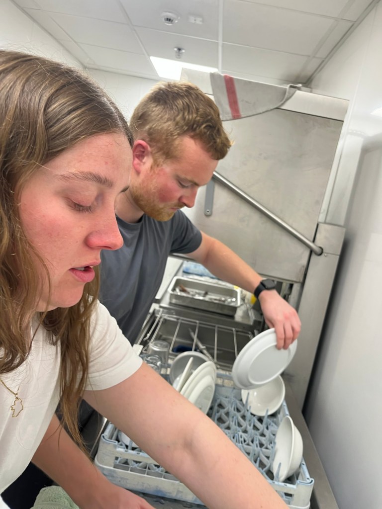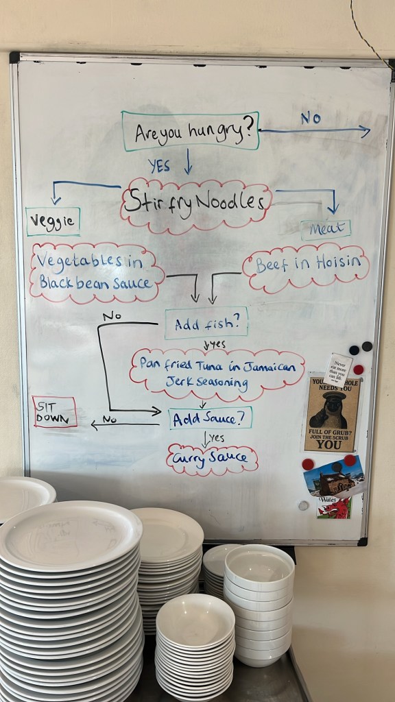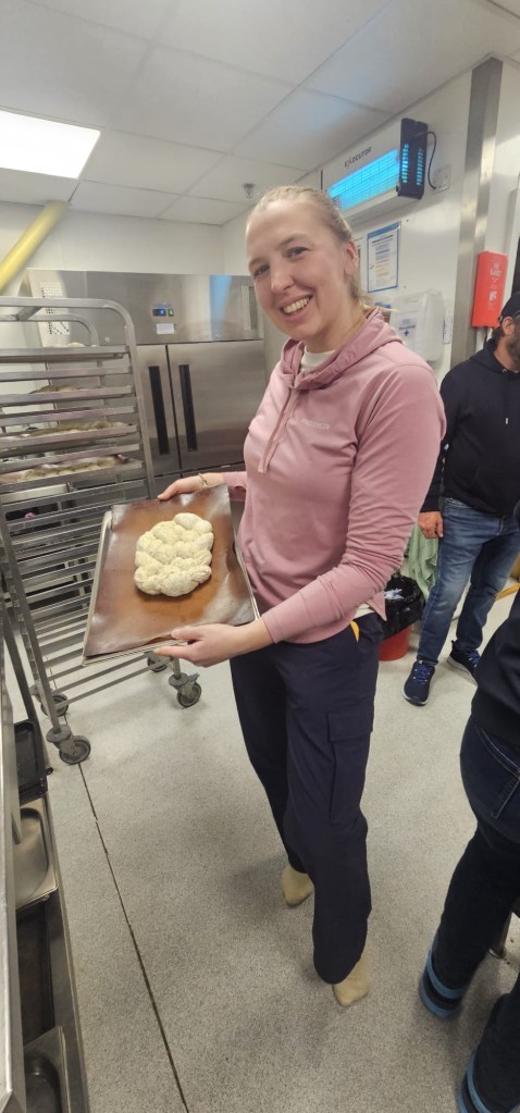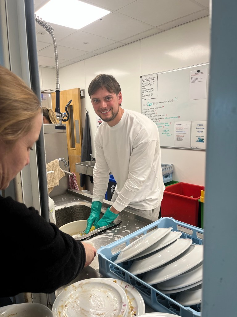 Alongside the SSA (my) job to keep the kitchen and dining room clean, we have GASH. That’s Gulley And Scullery Hand. Someone is “on gash” each day to help out in the kitchen and dining room and it’s a really nice leveller of everyone serving others. Each Friday everyone down tools for scrub out and is assigned a task for an hour for the communal good. One of the popular jobs is the food move, where human chain transports the food from central stores into the kitchen dry store ready for the week! Whether it’s cleaning toilets or peeling garlic, the idea was good enough for Shackleton’s Antarctic missions!